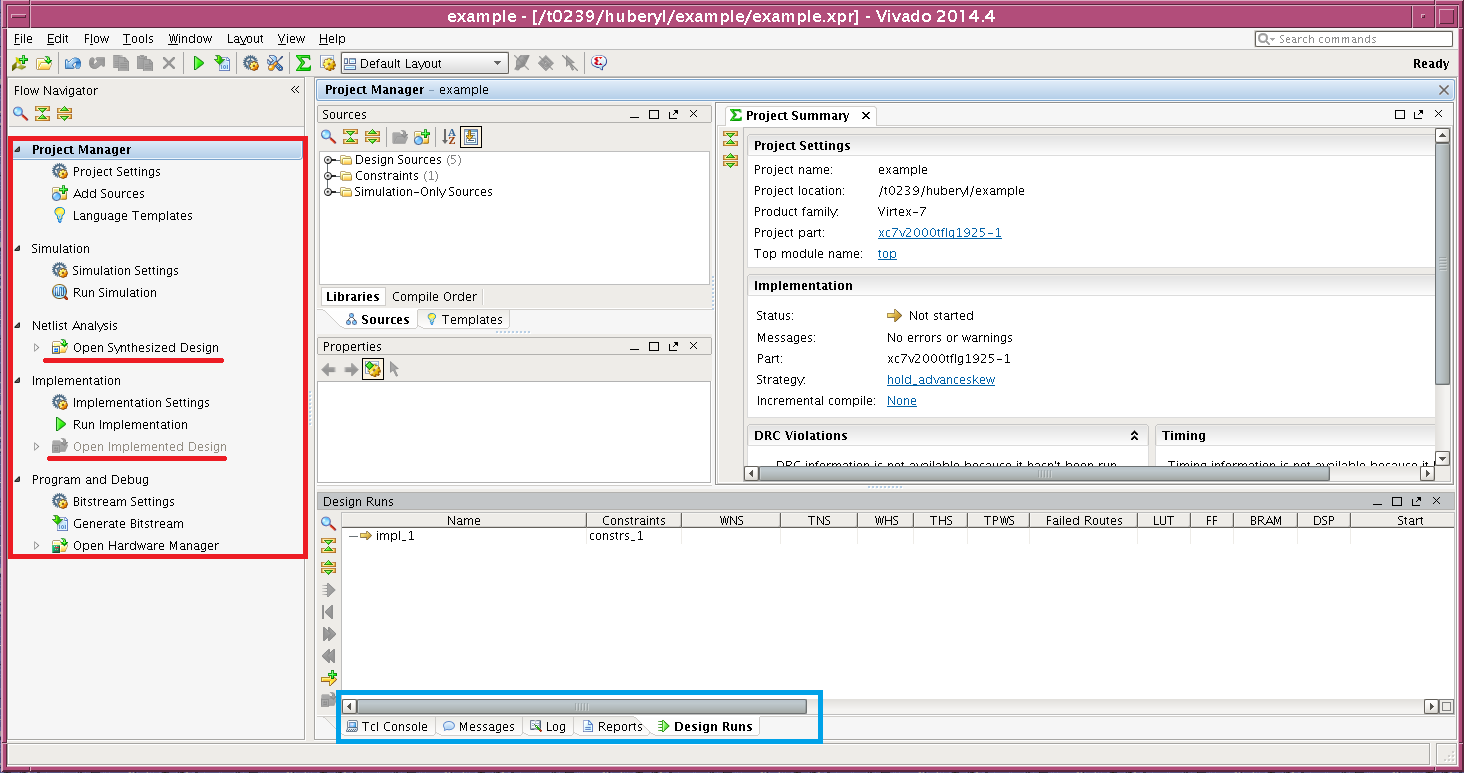 由于我们刚刚创建了project,没有run implementation,所以没有Implementationed Design。因为没有Open Synthesized Design,所以此时memory中没有任何netlist。