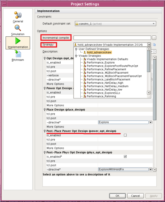 点击”Implementation Setting”,就会弹出如下界面。Implementation是一个比较复杂的过程,其中包括若干步骤,具体步骤的介绍我会单独写一篇博文来介绍(内容较多,比较复杂)。在这里我要简要介绍一些,有的步骤是必须的,而有的步骤是非必须的,比如图中的”Post-Place Power Opt Design(power_opt_design)”,如果没有勾选is_enable,那就不做这一步。而其中的”-directive”,则是由用户来指定不同的算法来实现。Vivado内部集成了很多Strategy,也就是图中的红框,用户可以自行选定,也可以自己定制最适用于自己的Strategy,比如我就定制了一个名为hold_advanceskew的Strategy。至于如何定制属于自己的专属Strategy,一方面要了解Vivado的各种Strategy,再有就是了解自己的design,多尝试集中Strategy,这样才能找到最适用于自己的Strategy。