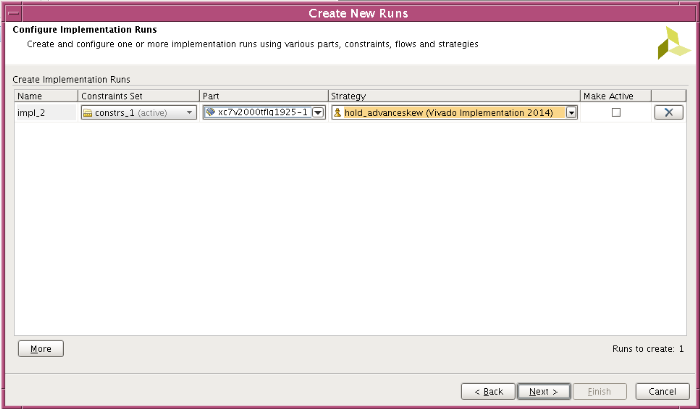 之后会弹出如下窗口,我们可以创建runs,并设置不同的constraint、Strategy。注意Make Active一项,一个project可以有多个runs,但是能有一个Make Active。导航栏的操作,都是对Make Active的runs进行的。
