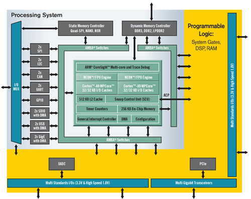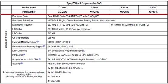 PS部分的核心为双ARM Cortex-A9处理器,每个核心最高主频能达到1GHz,并拥有NEON协处理器用于媒体处理工作;cache缓存方面,每个核心都有一个32KB的一级缓存,两个核心公用一个512KB的二级缓存;memory方面,自带256MB的片上RAM,并且最高扩展64MB的外部RAM,支持DDR3、DDR2或者LPDDR2控制接口;I/O外设和接口方面,支持I2C、SPI、CAN、UART、GPIO、SDIO、USB和Ethernet控制接口,也就是说这些控制器都是硬核。如图2所示为个型号zynq芯片PS部分概况。