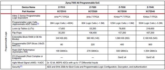PL部分沿用了7系列FPGA的结构,到目前为止xilinx公布的4款zynq芯片型号中,XC7010和XC7020沿用了ArtixTM-7 FPGA的结构,而XC7030和XC7045沿用了KintexTM-7 FPGA的结构,如图3所示为各型号zynq芯片PL部分概况,具体7系列FPGA的内部结构在我的几篇《xilinx 7系列FPGA探索》系列博文中有详细介绍。