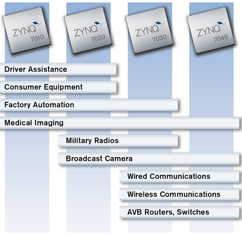 一款芯片如果想要推广,必须需要市场,从xilinx最近的市场动态就能反映出zynq是它们近几年主推的芯片,如图4所示为xilinx对各型号Zynq芯片定义的应用市场。