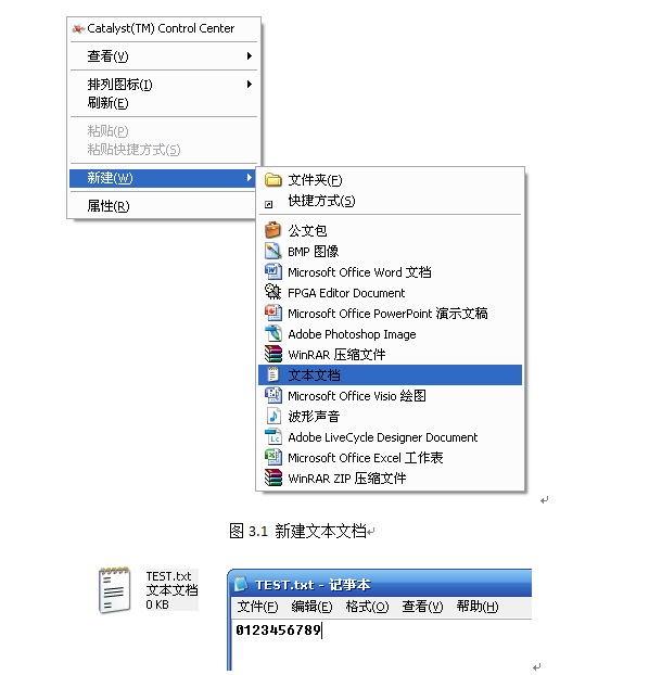 如图3.1所示,我们随便在电脑桌面的空白处点击右键,然后选择新建一个文本文档。我们修改这个文本文档的名字为“TEST”,接着打开文档,在其中输入ASCII码“0123456789”,如图3.2所示。需要事先提醒大家的是每个ASCII码的实际存储都有8位的数字与其对应,也就是说,我们看到的ASCII码是一种形式,而它实际存储在硬盘中又是另一种形式(即8位2进制的数据,汉字也是与此类似,通常用2个字节来表示一个汉字,如一个比较常用的汉字标准叫做GB3216,大家可以到网络上搜索这个标准)。在网络上也很容易就可以搜索到一个固定的ASCII码表。“TEST”对应的数字存储形式分别为16进制的0x54、0x45、0x53、0x54,“0123456789”对应的数字存储形式分别是16进制的0x30、0x31、0x32、0x33、0x34、0x35、0x36、0x37、0x38、0x39。