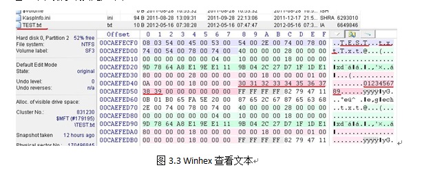 通过连接到PC机的显示器,我们看到了命名为TEST的txt文本,这个文本打开后有一串数据0123456789。那么如何知道它在硬盘中实际上真的如笔者所言是以特定的数字存在的呢?很简单,我们可以找个小工具,叫做Winhex,使用该工具可以查看咱们硬盘中所有资料的实际数字存储值。如图3.3所示,打开我们的TEST.txt文本,在实际数据“30 31 32 33 34 35 36 37 38 39”之前,出现了文本名“TEST.txt”对应的数据“54 45 53 54 2E 74 78 74”,而且在文本名称和实际数据之间有一串乱七八糟我们搞不懂的数字,这个也是文本文件帧头相关的数据,如文本的创建时间、修改时间等信息。读者若是感兴趣可以自己找找文本文件的格式解析好好研究一下,笔者只是点到即止,希望给大家传递一个信息:在咱的“数字设备”中,数字确实无处不在。