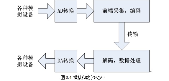 看过以上的例子,大家可就要纳闷了,既然所有资料都是以数字的形式存在,为什么我们所看到的现实世界却是如此色彩斑斓、形式多样?答案很简单,数字虽强大,在现实世界中还是要依靠模拟作最终的载体。如图3.4所示,目前我们所能接触到的各种设备,大都需要经过与此类似的模拟、数字再到模拟的转换过程。原始的一些模拟设备提供了待采集的信号,经过AD转换芯片处理后量化为数字信号,这些数字信号在前端被采集,如果是自成系统的设备,通常直接就在本地处理后经过DA转换芯片以特定的模拟设备的形式表现出来。当然了,也许不一定是用完全和采集时一样的模拟设备进行还原,也可能是以其他的形式表现原有设备的某些特性。而如果本地系统没有强大的CPU支持数据的处理,而只是负责采集数据,那么通常还会对采集到的数据进行编码或压缩,并通过各种远程传输设备送到拥有强大处理器的远端,远端会对采集的数据进行解码还原,然后进行处理,最终还是会以模拟的形式表现出来。