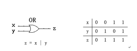 或门的符号和真值表如图3.7所示。输入x和y进行或运算后得到结果z。或运算的原则就是“遇1则1,全0则0”。