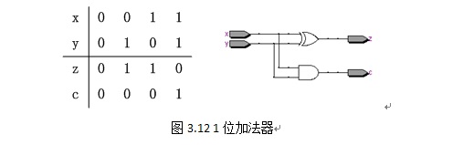 下面列举一个最简单的1位加法器的例子,如图3.12所示,x和y相加,其结果为z,进位为c。我们观察其真值表发现:z = x^y,c = x&y。果然,1位加法非常轻易的用两个逻辑门电路实现了。