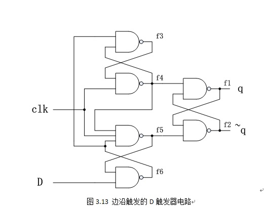 接下来,我们要用这些基本的逻辑门搭个复杂点的电路。这个电路如图3.13所示,这是边沿触发的D触发器电路。该触发器的功能是实现时钟信号clk上升沿(由0变化到1)时将输入信号D的值锁存到输出信号q。