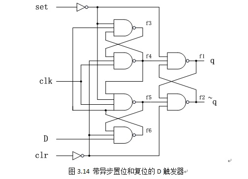 如图3.14所示,这是一个带有异步置位和复位功能的D触发器。所谓置位,即set信号有效时(即为1时),该电路无论时钟clk和输入D值的状态如何,输出q一定是1;同理,所谓复位,即指clr信号有效时(即为1时),该电路无论时钟clk和输入D值的状态如何,输出q一定是0。有了set和clr信号,我们可以在任何时刻得到需要的输出q信号值,当然了,一般只有在系统上电初始或者出现异常后才会执行这样的操作。