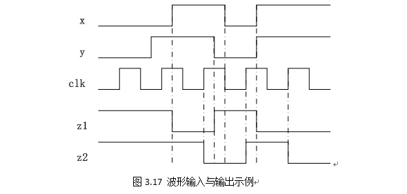如图3.17所示,以上面的组合逻辑和时序逻辑电路为例,输入信号x和y为随机信号,组合逻辑的输出信号z1在输入x和y发生变化并满足逻辑变化条件时立刻发生变化,当然了,这个变化在实际电路中也有一定的延时。而在时序逻辑中,该实例除了组合逻辑满足条件外,只有在时钟信号clk的每个上升沿输出z2才会发生变化。这里有一个细节大家也需要注意,x和y的组合逻辑输出值在时钟上升沿到来的前后的某段时间内(即建立时间和保持时间)必须是稳定的,否则有可能锁存到不稳定的值(即亚稳态)。