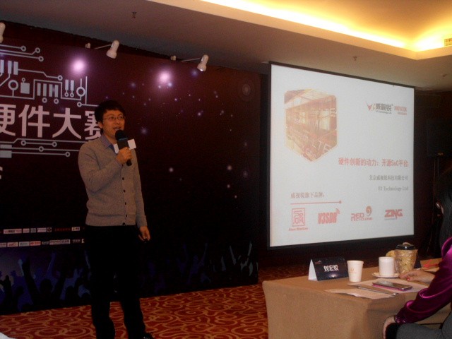 科通芯城营销副总裁刘宏蛟发表i 未来硬件大赛启动演讲。”硬蛋·i未来硬件大赛“在2014年2月份和3月份分别在深圳和北京有两场初赛,3月份会举行决赛。初赛分为大众评委和专业评委,很象中国好声音。整个大赛的目的,主办方为大家提供的资源和支持,不仅仅是参赛的奖项还有包括制造业、互联网、投资人等的导师团队。