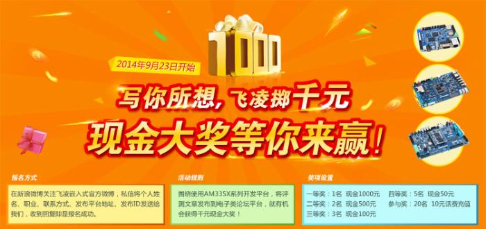 飞凌嵌入式基于Cortex A8 AM335x平台发行的OK335X系列开发平台自上市以来一直受到各界嵌入式爱好者的亲睐和关注,为了回馈广大飞凌用户,现展开大型征文活动,只要您持有飞凌AM335x系列开发平台中任何一款开发板,都可以加入到我们的活动中来,在这里,只要您愿意,就可以写您所想,报名参与活动将您的使用心得及评测文章发布到任何电子类论坛平台,就有机会获得千元现金大奖!