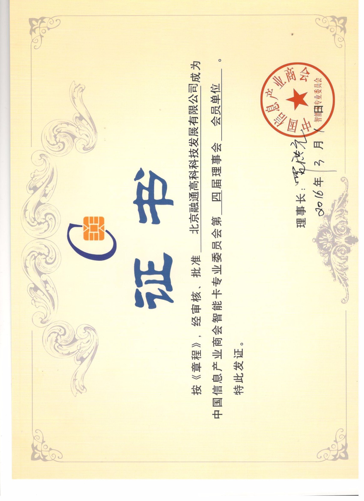 北京融通高科科技发展有限公司获得智能卡专业委员会会员证书