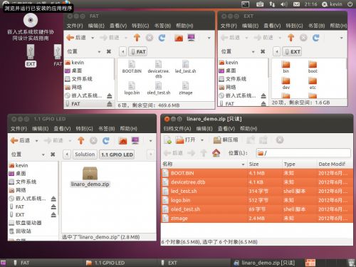 大家可以看到, SD卡分了两个区, 一个是FAT,一个是EXT, FAT里面从光盘里拷贝了引导文件BOOT.BIN, 以及linux的压缩内核, zImage. FAT盘里面的文件,要想拷贝过去很简单,只需要把linaro_demo.zip里面的文件之间拖过去就可以了。