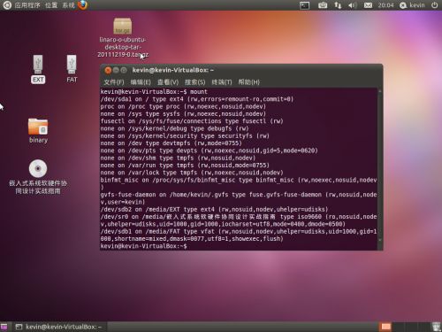 从这里面可以看出来, EXT盘对应的目录是 /media/EXT, 设备嘛, 就是/dev/sdb2 意思是scsi硬盘第2个,分区2的意思。 俺的SD卡读写器让系统看上去是一个scsi硬盘。 在用命令行拷贝文件到EXT盘时, 需要右键点弹出这个盘,在Ubuntu的桌面上没有这个盘符就可以了。
