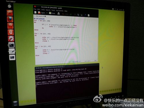 ZED板的出现,使得文本编辑可以直接用图形化的gedit, 方便多了。当ZED板的Ubuntu跑起来以后, 一方面,看到了漂亮的Unity图形界面,另一方面,串口上还有一个以root身份登陆进去的终端. 图形界面嘛,是以linaro身份自动登陆进去的, 密码就是linaro。