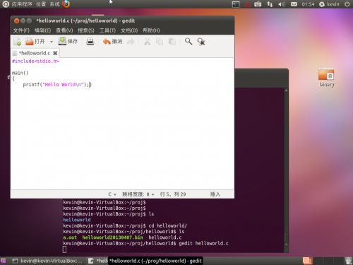 然后,就可以写一个helloworld.c 了, 就用gedit写吧,上网搜了拷贝过来也可以. 然后, 用gcc编译一下。 如图: