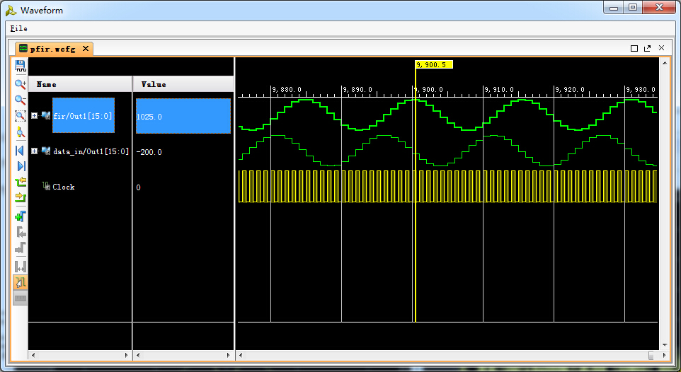 上图为单个25M正弦波作为激励信号的模型输入和输出信号。当前光标位置输入数据为1025,此fir滤波器时域上对信号有19个周期的延迟,19个周期后的数据为1024,那么20lg(1025/1024)=0.008db 抖动小于通带内抖动值0.03db。