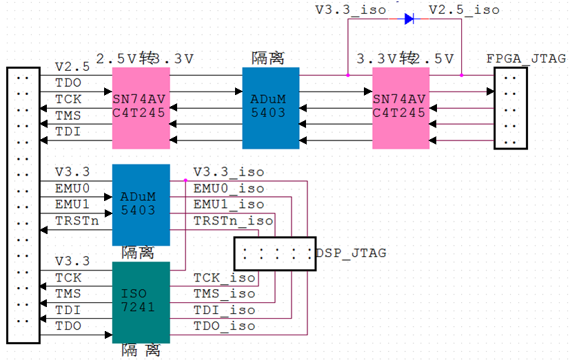 不同之处:FPGA为2.5V电源,而电源隔离芯片工作电压为3.3V,需做转换