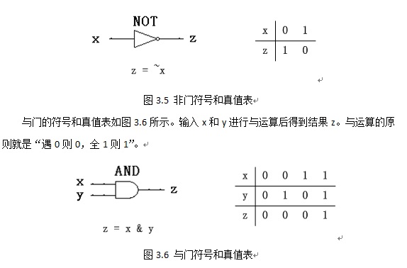 0和1,他们的最基本逻辑运算是通过非门、与门和或门来实现的。非门的符号和真值表如图3.5所示。输入x经过非门后,输出z为x的取值反向,如输入x=0则z=1,反之,输入x=1则z=0。
