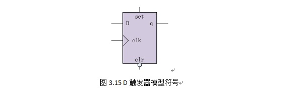 如图3.14所示,这是一个带有异步置位和复位功能的D触发器。所谓置位,即set信号有效时(即为1时),该电路无论时钟clk和输入D值的状态如何,输出q一定是1;同理,所谓复位,即指clr信号有效时(即为1时),该电路无论时钟clk和输入D值的状态如何,输出q一定是0。有了set和clr信号,我们可以在任何时刻得到需要的输出q信号值,当然了,一般只有在系统上电初始或者出现异常后才会执行这样的操作。