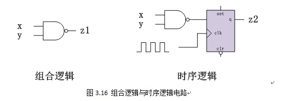 如图3.16所示,同样是简单的与非门电路,左侧为组合逻辑,右侧则为时序逻辑。