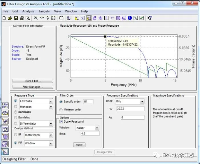 通过matlab可以快速的设计滤波器,直接导出滤波器系数,方便大家快速设计。上图使用Kaiser窗函数设计了一个采样率为30.72MHz的15阶8M低通滤波器。File – Export 将设计好的滤波器系数Num导出到Workspace。