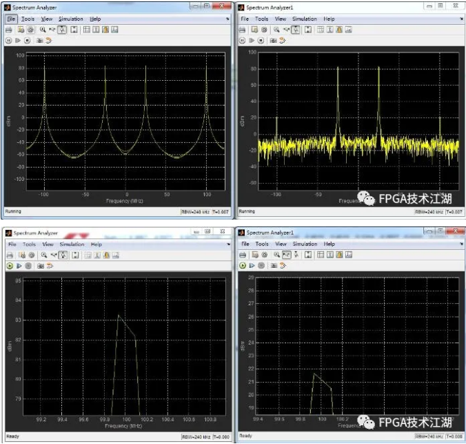 上面左图为滤波器输入信号,右图为滤波器输出信号。观测可知此滤波器对25MHz信号功率没有影响,对100MHz信号衰减了约60db左右,将图放大可知输入100MHz功率为83.2dbm输出为21.6dbm,衰减了61.2db。由此可知与fdatool设计的滤波器性能相同。
