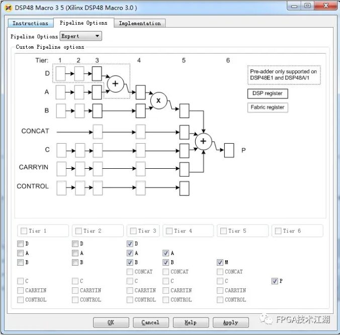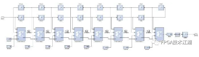 上图设计的fir滤波器,DSP的PCIN输入为上一级DSP的PCOUT信号,这样做的目的是充分利用DSP的快速进位链,使实现变得容易。最后一拍数据直接使用的DSP的P端输出。