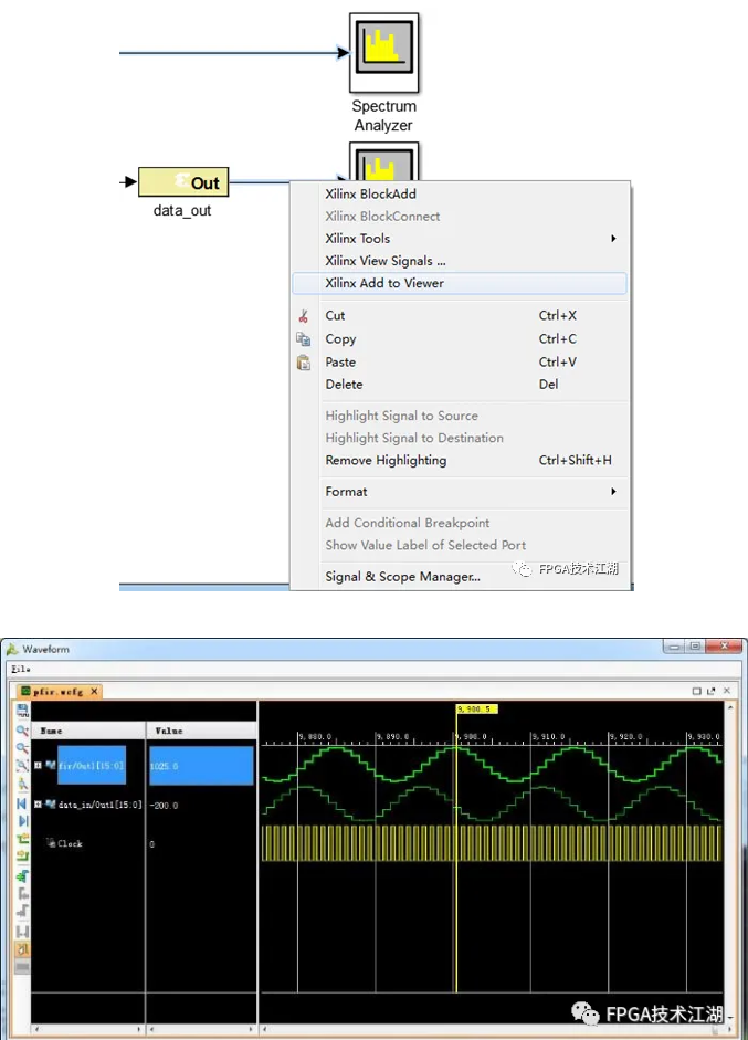 xilinx在新版本的vivado中将simulink中的WaveScope删掉了,信号观测方式换为和vivado debug相同的窗口,更为灵活和人性化。添加信号的方式更为简单,选择好需要观测的信号后直接右键单击Xilinx Add to Viewer。这时启动仿真将自动打开vivado的Waveform窗口,可以在时域上观察每一个点的数据。