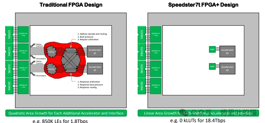 在Bus Routing上,Achronix的FPGA更是有绝对的优势,他们专门为这种高带宽的互联做了设计和优化,更是在FPGA上集成了NOC,跟传统FPGA中的routing有很大的区别,这也让我们在复杂设计中可以减少因为Congestion导致的各种问题,减少代码的开发和编译时间。