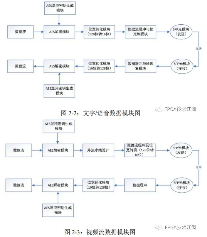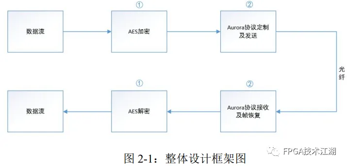 设计了一套完整的光纤通信加密系统(如图 2-1)。系统链路部分采用 Aurora 协议,该协议是一款轻量级的光纤链路协议,具有冗余少,可定制度高,链路速率快等特点。加密协议采用目前 AES256 加密算法,该算法为目前国际最标准化加密算法之一,可抵抗所有已知的攻击,并可在多个平台上拥有速度快,编码紧凑等特点。