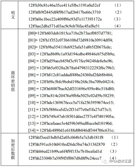 为了验证优化后 AES 算法功能的正确性,需要选取测试向量进行验证。我们 从官方的文档中获得参考基本功能测试向量。