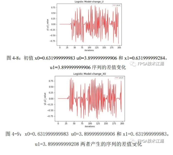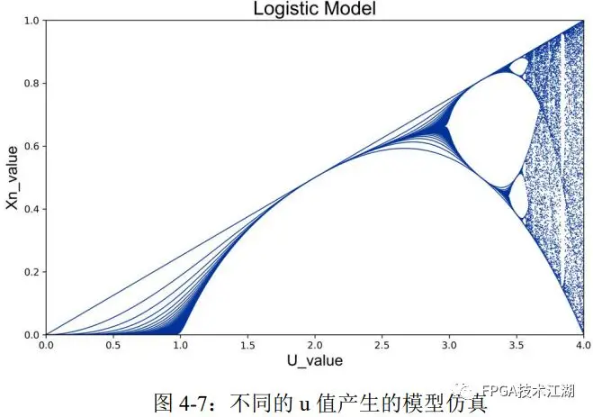混沌序列的产生主要有两类:一类是利用微分方程表示的混沌系统,产生时 间连续的混沌信号,系统由模拟电路来实现,它对电路固有参数及信号再生的误差很敏感,实际实现较困难。另一类是利用迭代方程(映射)或非线性数字滤波器结构表示的混沌系统,产生时间离散的混沌序列,系统由数字电路实现,更适合在通信中应用。本设计需要在 FPGA平台上实现,鉴于 FPGA 无法处理连续时 间系统,所以基于迭代方程来产生混沌序列,之后使用定点小数的方式对方程中的实数进行了处理,使其能在 FPGA 中进行运算。为了使该输出混沌密钥与发送 的明文产生时序相匹配,在输出之前还做了部分拼接操作,使整体序列保密性更高。