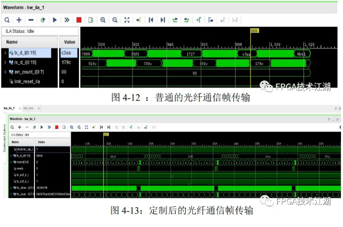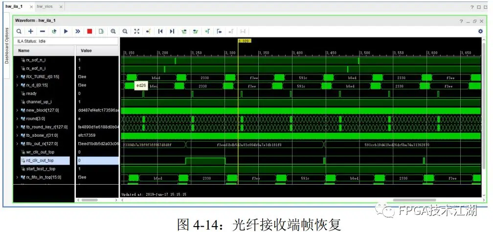 如图 4-14 所示,我们将光纤接收端接收到的数据(rx_d_i)接收下来,并将 其进行 16 位转 128 位操作,输出数据为 fifo_out_rx,我们对比测试向量的数据发 现,我们的数据是正确无误的。