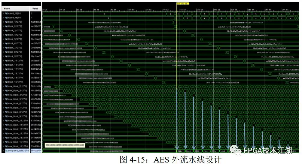 针对视频流数据,我们同时使用 15 个加密模块,分别错开一个周期进行同时 加密。如图 4-15 蓝色箭头所指:每个加密模块完成加密后,将加密数据送至寄存 器缓存,使得我们的加密效率提高了 15 倍。