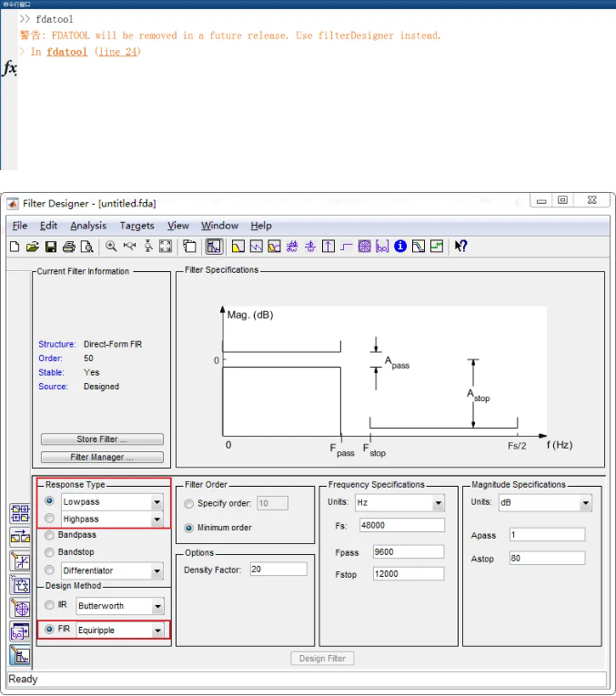 首先,我们打开matlab软件,在命令窗口输入fdatool并回车,就会弹出滤波器设计工具。