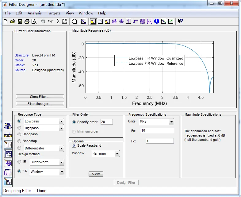 在此,给大家一个示例,窗函数我选择的是汉明窗,采样频率为10MHz,截止频率为4MHz。计算阶数为20。大家可以看一下效果图,还是比较理想的。