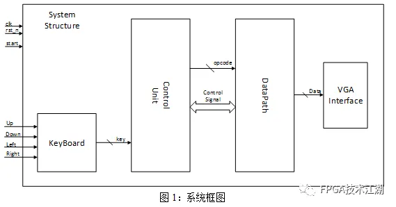 整个系统由四部分组成,按键输入处理模块、控制模块、数据路径模块以及VGA显示接口模块。整个系统的结构如下图所示: