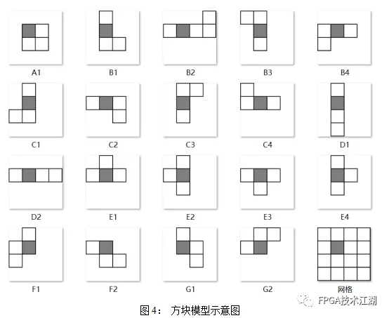 俄罗斯方块共有7种形状的方块(O,L,J,I,T,Z,S),每种方块有1-4种不同的旋转变形方式。为方便起见,将方块定位A-G,旋转编号为1-4,将方块编码成A_1-G_2的19种,如下图:(图中,深色方块是该种方块的固定点)