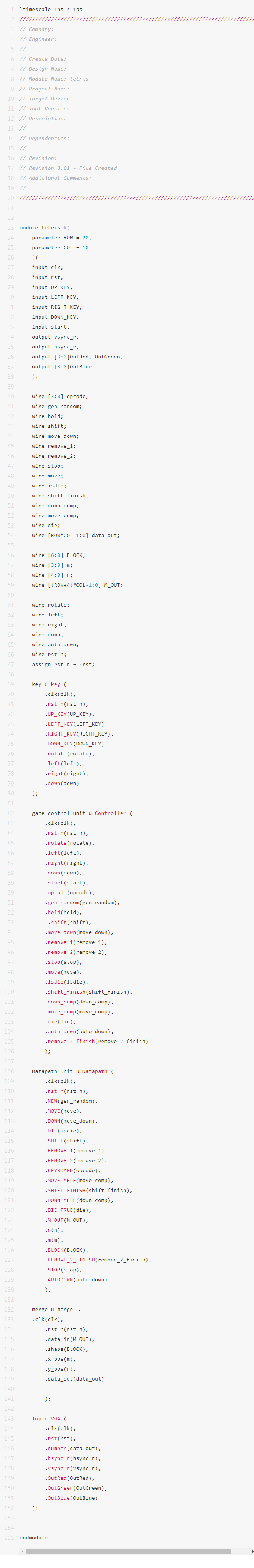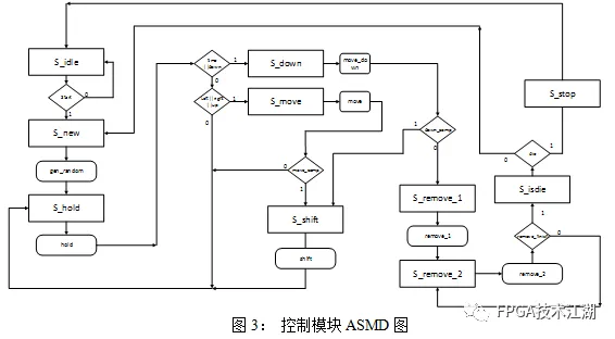 S_isdie:判断是否游戏结束。如果结束,则跳转到S_stop状态。如果没有,则跳转到S_new状态,生成新的俄罗斯方块。