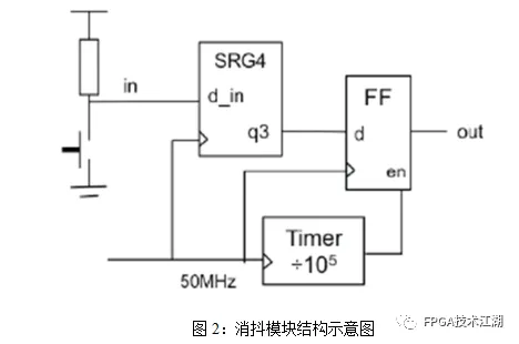 消抖模块采用了一个4位的移位寄存器,先将输入信号延迟4个时钟周期,再对其以一个较低的时钟频率进行采用。消抖模块的结构如下图所示: