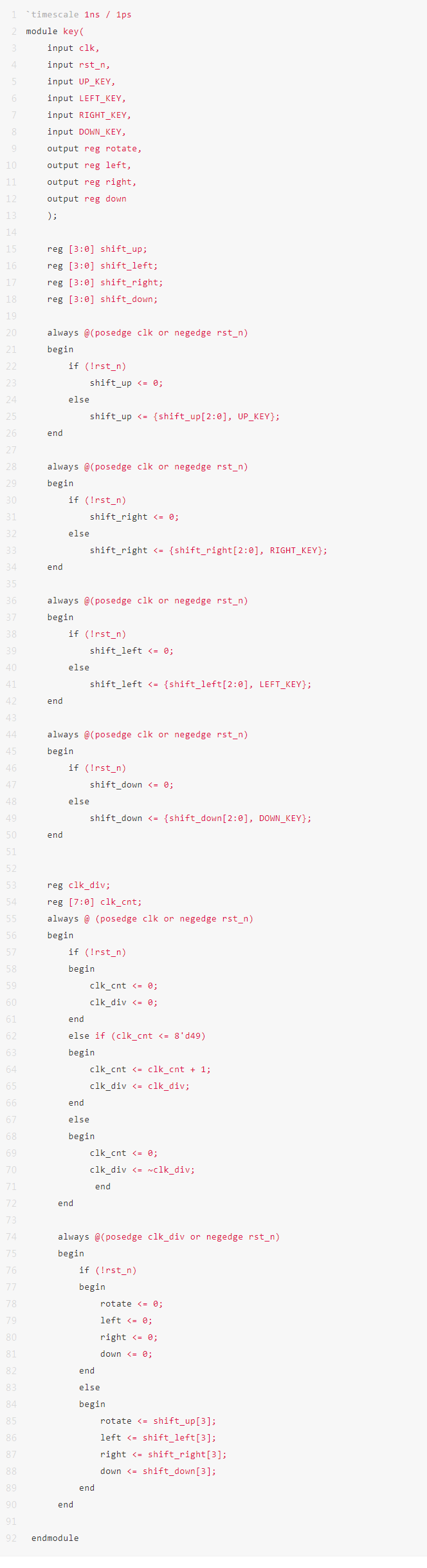 按键处理模块的主要功能是对输入系统的up,down,left,right四个控制信号进行消抖处理,并对其进行上升沿检测。