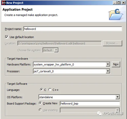 在SDK中->File->New->New Application Project->设置如下,点next->选hello world。