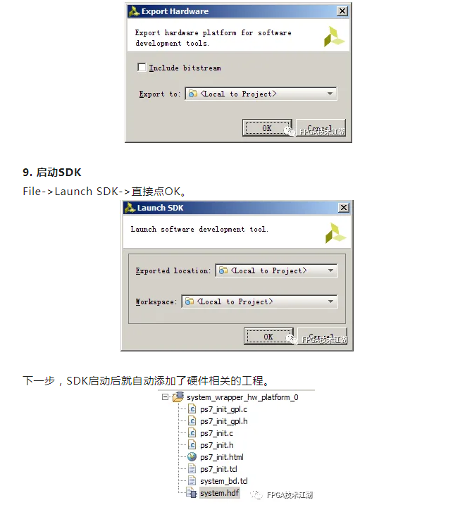 导出前要确保Block Design是打开的,即Diagram界面要打开File->Export->Export Hardware->直接点OK,这样会把硬件文件system_wrapper.hdf导到helloword.sdk文件夹下,SDK工程也在该目录下。