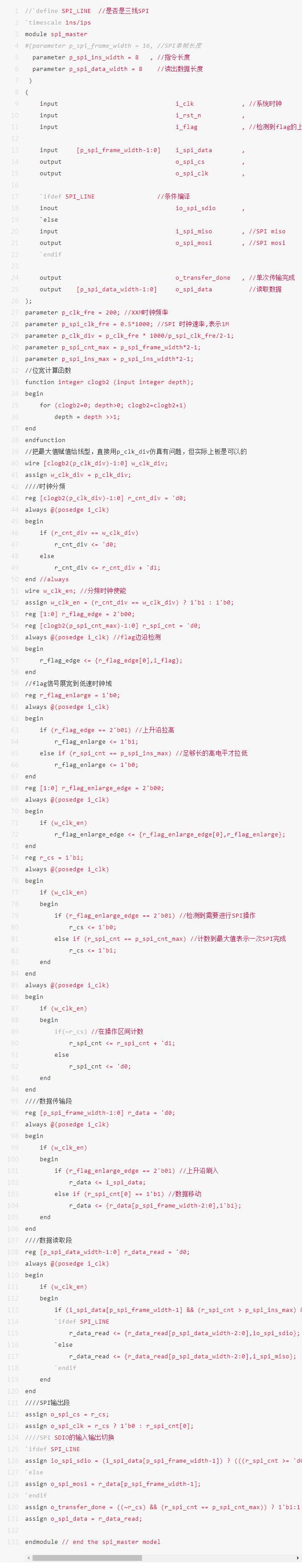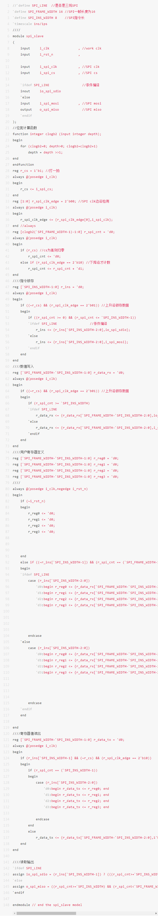 为了避免每次SPI驱动重写,直接参数化,尽量一劳永逸。SPI master有啥用呢,你发现各种外围芯片的配置一般都是通过SPI配置的,只不过有三线和四线。SPI slave有什么用呢,当外部主机(cpu)要读取FPGA内部寄存器值,那就很有用了,FPGA寄存器就相当于RAM,cpu通过SPI寻址读写数据。代码仅供参考,勿做商业用途。