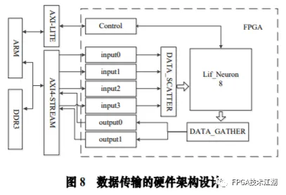NEST仿真器运行在ARM核,通过AXI-LITE控制LIF_NEURON神经元计算模块,并将神经元总数量 通过寄存器输出到LIF_NEURON硬件模块。AXI-STREAM协议由四个DMA控制器实现,通过 AXI-STREAM将神经元变量参数写入到输入缓冲,通过DATA_SCATTER模块分发到LIF神经元中各个 变量,LIF_NEURON神经元更新完成后,通过DATA_GATHER模块写回到输出缓冲。本文采用8个LIF神 经元并行计算,并通过分时复用的方式读取和更新共享内存中的数据。