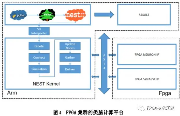 本系统由包含 PYNN 类脑框架、NEST 仿真器、PYNQ 框架以及 FPGA 神经元和 STDP 硬件模块。如图 4 所示,顶层应用设计语言为 Python,在 PYNN 架构协助下调用 NEST 仿真器, 各种命令通过 python interpreter 和 SLI interpreter 解释后,进入 NEST kernel。根据各种命令进行底层网络创建包括神经元创建、突触连接创建、仿真时间设置等。