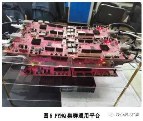 如图 5 所示,本课题的通用平台集成 16 块 PYNQ 板,板级连接遵循 TCP/IP 协议。PYNQ-Z2 开发板以 ZYNQ XC7Z020 FPGA 为核心,配备有以太网,HDMI 输入/输出,MIC 输入,音频 输出,Arduino 接口,树莓派接口,2 个 Pmod,用户 LED,按钮和开关。