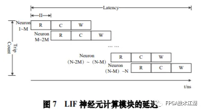 神经元流水线结构如图 7 所示,其分为数据读取 R,神经元计算 C,数据写回三个模块 W。LIF 神经元硬件架构数据流和控制流如图 8 所示: